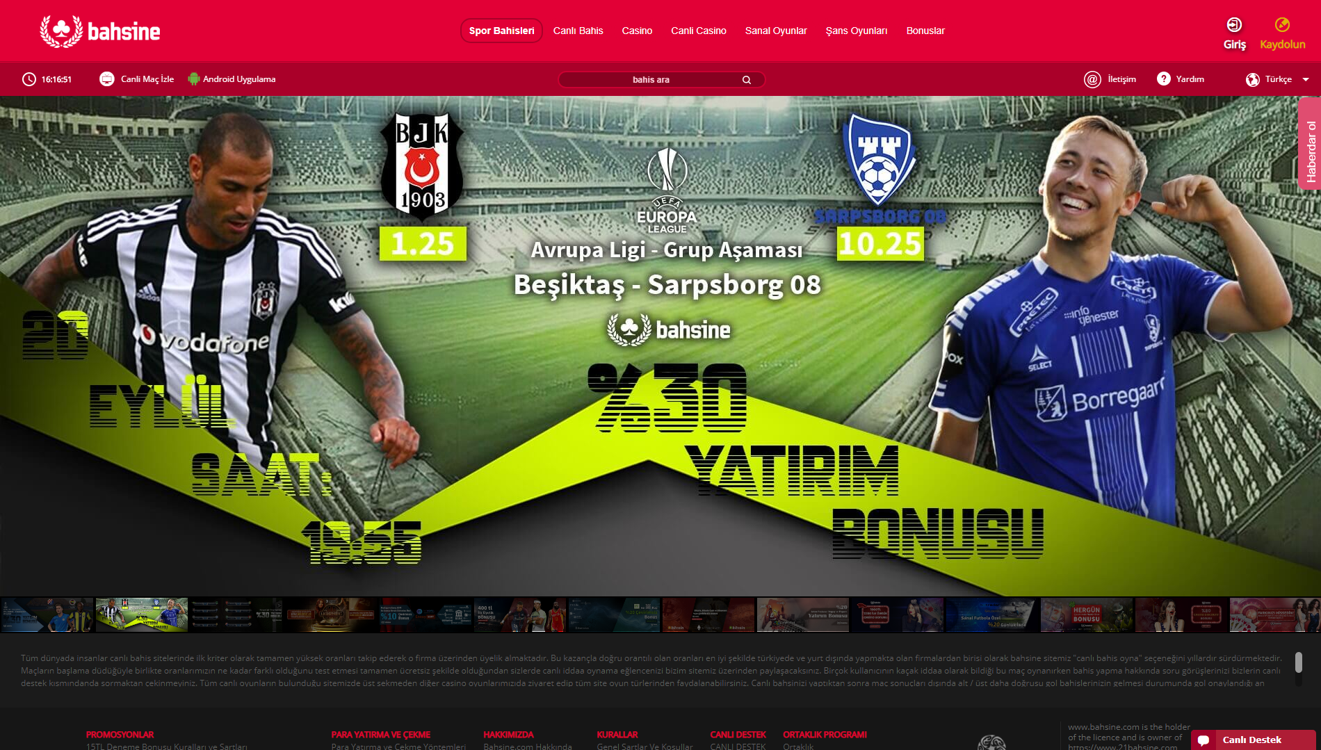Bahsine sitesi size birçok bahis oynama imkanını sunmaktadır. Spor bahisleri, casino, canlı casino, poker ve tavla gibi ürünlerde müşteri memnuniyetine dayalı olmak kaydıyla bahis hizmeti vermektedirler. Spor müsabakalarında ayda 20.000’den fazla karşılaşmaya canlı bahis üzerinden oynayabilirsiniz. Bu oran ortalama bir bahis sitesine göre oldukça fazladır. Sitenin en önemli özelliklerinden diğeri ise müşteri hizmetlerinin iyi olması. Site müşteri odaklı çalıştığından dolayı canlı destek ve mailden iletişime geçerek problemlerinizi çözebilirsiniz.