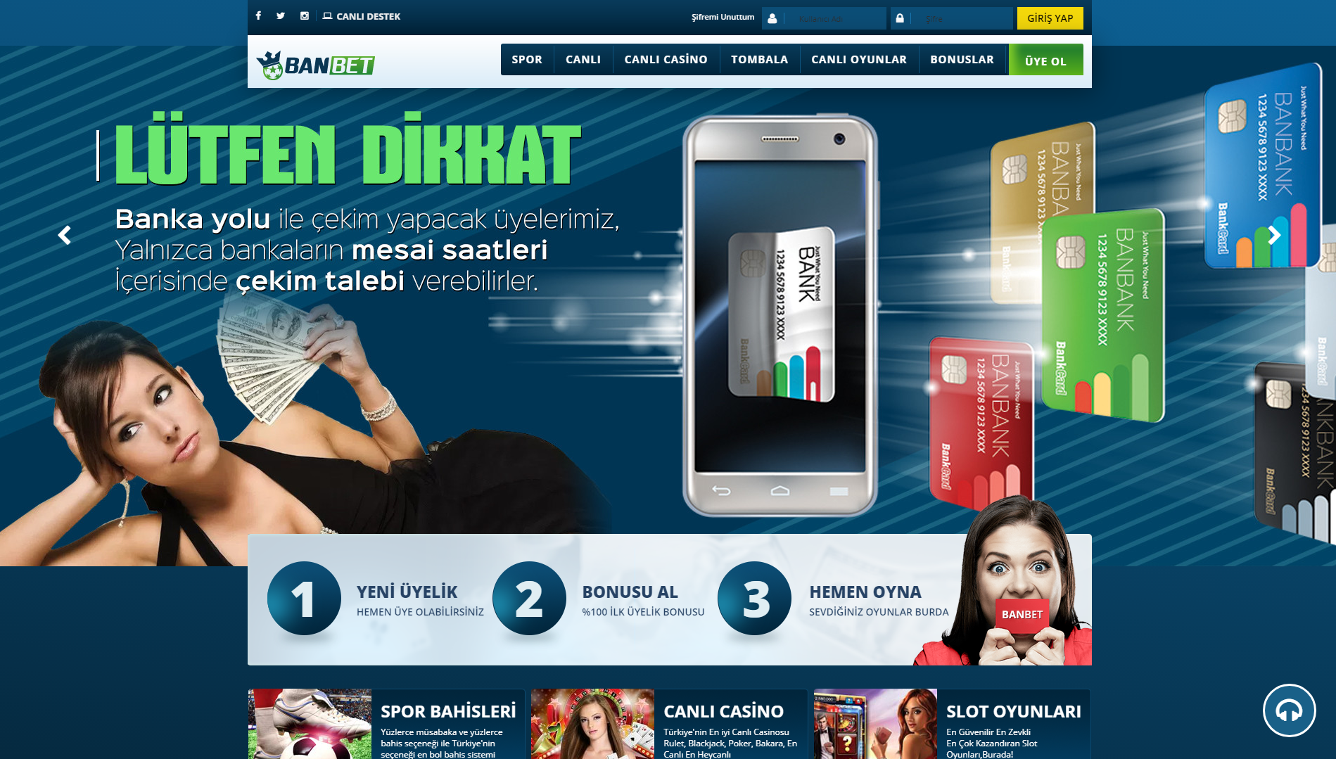 Banbet’in en önemli özelliklerinden biri şık bir tasarımı olması. Bu tasarım şık olmasının yanı sıra kolay bir işlemi de sizlere sağlamaktadır. Her türlü işleminizi basitçe gerçekleştirebilirsiniz. Diğer bir özelliği ise sizlere sunduğu bonuslar. Siteye ilk defa üye olacaksanız ilk üyelik bonusunuz olan 100 TL’lik bir bedava bahis tahmininde bulunma imkanını sizlere sunmaktadır. Bonus siz üye olduğunuzda hesabınıza yüklenir. Eğer tahmininiz doğru çıkarsa 100 TL hesabınıza yüklenir. Gerekli konu hakkında bilgiyi müşteri hizmetlerinden alabilirsiniz.