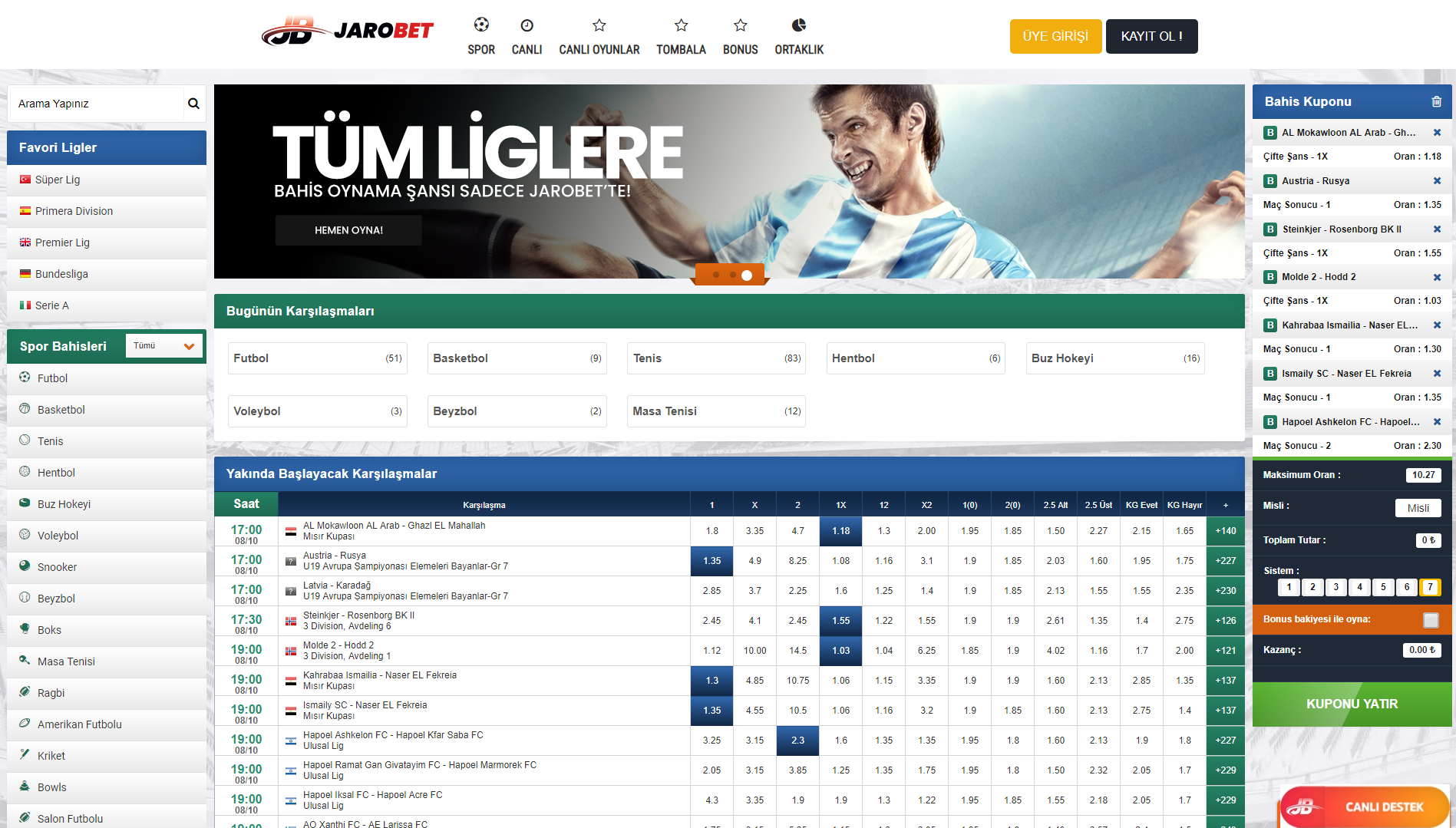 Jarobet 2016 yılında açılmış olan günümüzde de hala fazlaca tercih edilmeye devam eden bir bahis sitesidir. Site uzun yıllara dayanan bilgi ve birikimiyle beraber hızlı bir hizmet sunmaktadır. Sitede hızlı müşteri hizmetlerinin dışında kullanıcılarına güven veren bir lisansa sahiptir. Bu lisans ve güvenlik hizmetleri sayesinde kullanıcılarına adil ve şeffaf bir şekilde hizmet vermeye devam etmektedir. Bu lisansı sitenin en alt kısmından kolaylıkla inceleyebilirsiniz. Ayrıca siteden ulaşabileceğiniz birçok alternatif bahis oyunu bulunmaktadır. Sitede ulaşabileceğiniz oyunlardan bahsedecek olursak spor müsabakaları özellikle birçok alternatifle dikkat çekmetkedir, casino, canlı casino, blackjack, slot oyunlar ve birçok bonus sitede sizleri beklemektedir. Bu bonusları sitenin en üst kısmından veya alt kısmından inceleyebilirsiniz. Site özellikle spor müsabakaları konusunda kendisine fazlasıyla güvenmektedir. Her ay 5000’in üzerinde canlı bahis oynama imkanını kullanıcılarına sunmaktadır. Ancak bunun yanı sıra sitede casino oyunları da bulunmaktadır. Bu casino oyunları sayesinde siteden rahatlıkla casino oyunlarını oynayabilmeniz mümkün