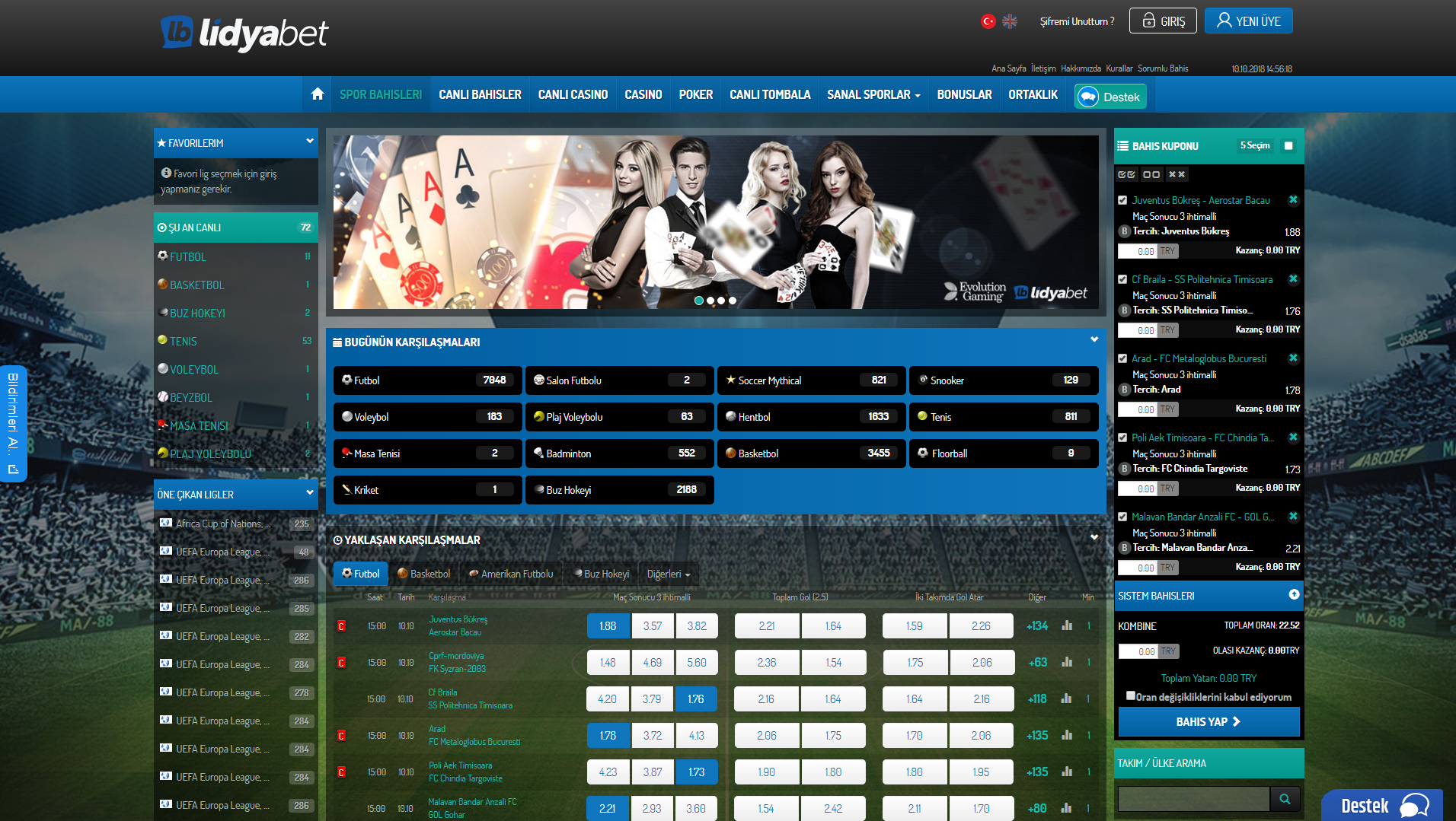 Kullanıcılar LidyaBet bahis sitesine üye olduktan sonra futbol, basketbol, voleybol, hentbol gibi spor oyunlarının yanı sıra; canlı bahisler, casino, canlı casino, poker ve sanal spor alanlarında bahis oranları vermekte ve kullanıcı odaklı düşünerek onların kazanması için uğraşmaktadır.